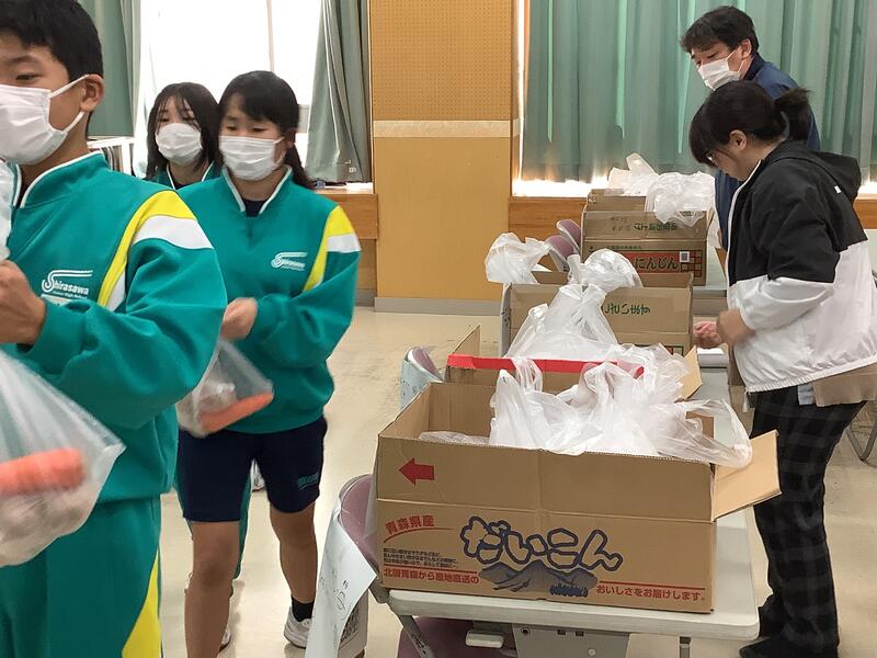放課後、明日の野外活動の野菜を配りました。各家庭に持ち帰り切って持参してもらいます。明日はとても楽しみです。保護者の皆様、明日は短い時間でもかまいませんので、お子様の活動をご覧いただければと思います。