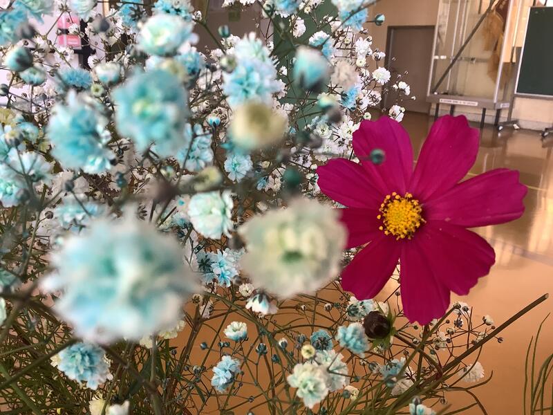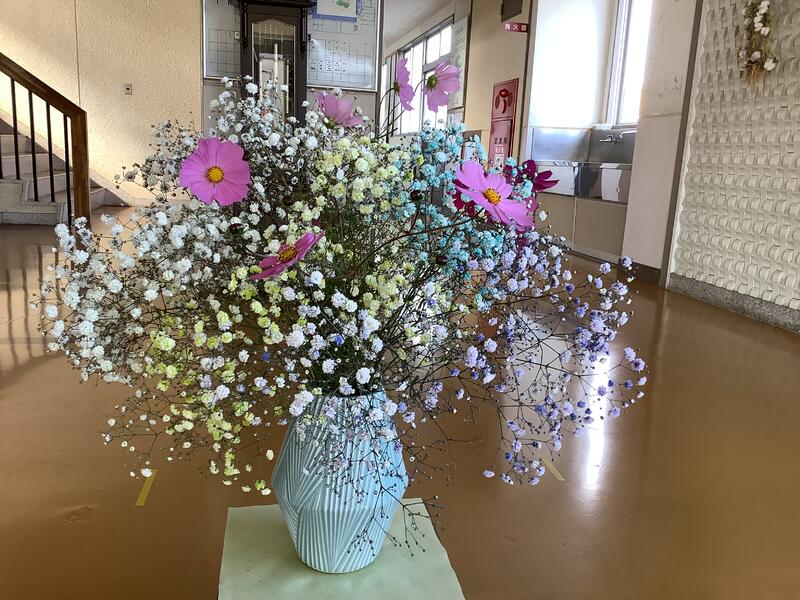 本日で10月も終わりです。今年もあと2ヶ月となりました。慌ただしい毎日ではありますが、心を落ち着かせて、足下を見つめる時間は欲しいものです。玄関に調理員の渡辺さんからいただいた、かすみ草を飾りました。かすみ草といえば、「かすみ草の村、昭和村」です。昭和村のかすみ草を玄関で見ることができるなんて、幸せなことですね。中学校では、いつでも季節の美しいお花を飾る準備をしております。職員、生徒達に季節を感じて生活をしてほしい願いもあります。いつでも受け付けておりますのでぜひお持ちください。よろしくお願いいたします。