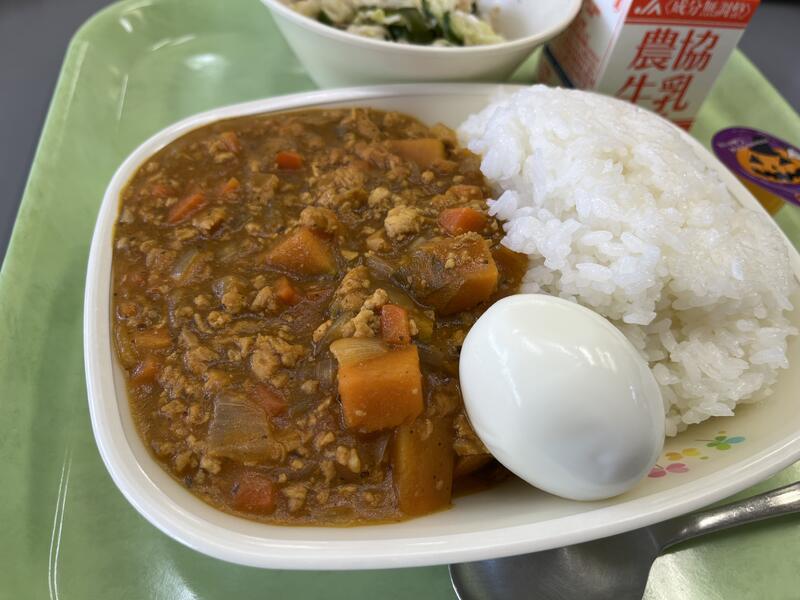そして今日の給食は、ハロウィンメニューです。カボチャ入りドライカレー(ゆで卵付き)でした。カレー皿も定着し、非常に美味しそうです。そして、柔らかいカボチャが最高でした。調理員さんは、この固いカボチャを、柔らかく食べてもらうために、汗だくになって細かく切ってくれたそうです。毎回痛感していますが、みんなが笑顔で美味しく食べられる裏には、手間が隠れていますね。