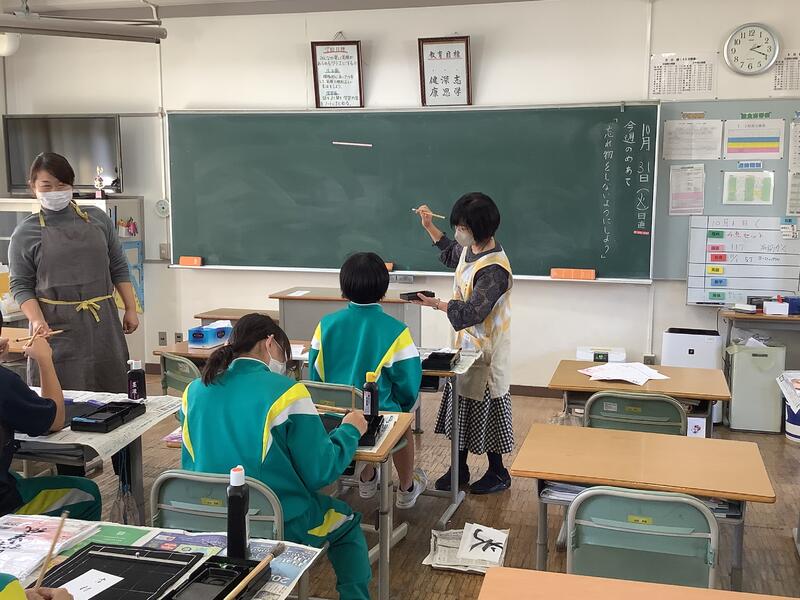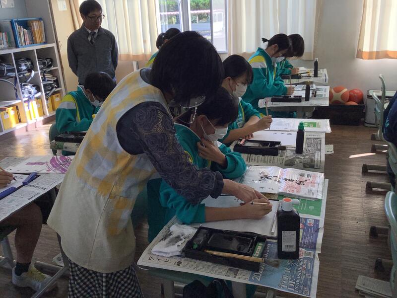 午後の1年生の書道の授業に、守谷さんに指導に入ってもらいました。守谷さんには、いつも賞状の名前や賞などを浄書してもらっています。今回は、自分の名前を行書で書く練習をしていました。姿勢を正す、筆を立てる、おへその前で書く、そして行書の書き方として、次に向かって筆を滑らしていくなど、きれいに書くためのポイントをアドバイスしました。美しい字は、美しい作法から生まれることがよくわかります。筆を使って自分の名前を書く機会は、大人になると更に増えていきますので、美しい字を習得してほしいですね。