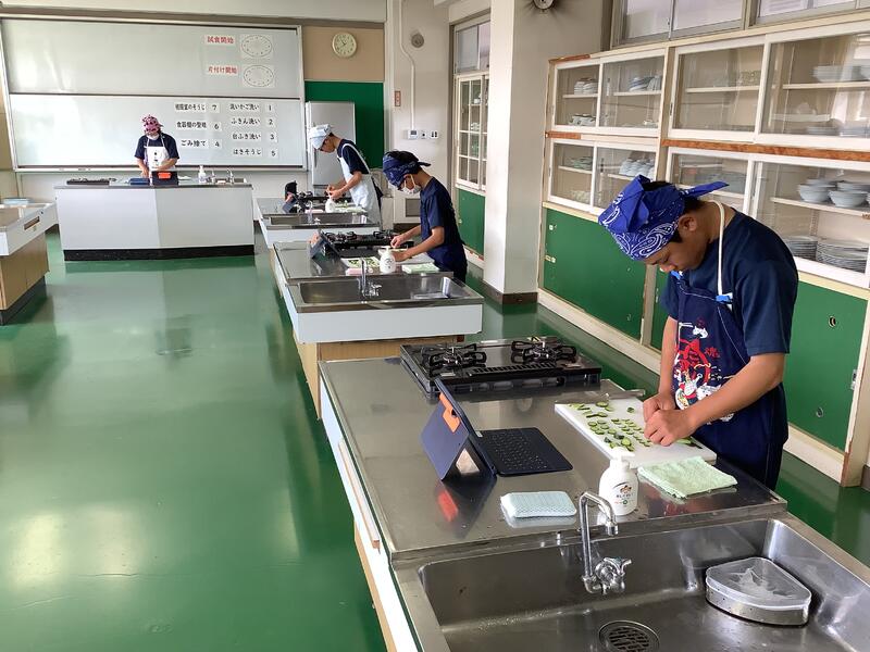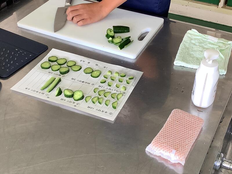 授業の紹介です。今日1年生では、家庭科でキュウリの切り方のテストを行っていました。タブレットと教科書を使い、いろいろな切り方を確認し、決められた時間の中で課題どおりに切るという実技をしていました。生徒達の取り組む姿勢は真剣そのもの。包丁を使うことは、そのまま生活に直結します。合間に生徒達に感想を聞くと、包丁を家で使ったことが無い、という生徒もいました。見学した私もたいへん勉強になるテストでした。食べることは生きること、家庭でも機会を見つけてやれるといいですね。