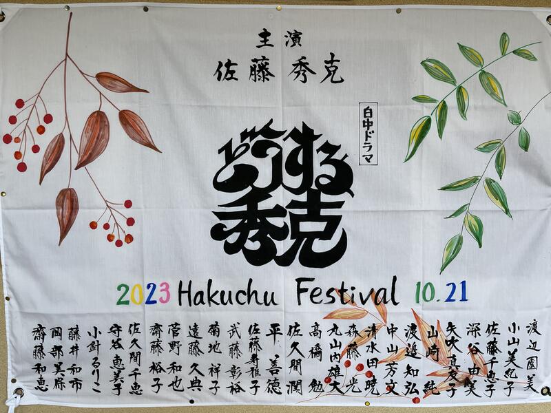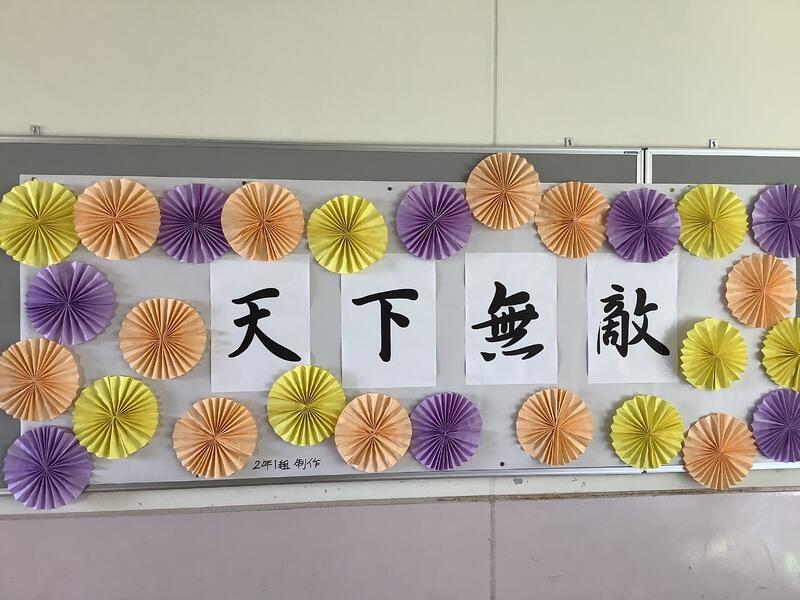 職員室前の廊下にも白中祭に合わせて、いつの間にか職員旗が完成していました。何と事務の守谷さんが残業をして制作していました。今年も見事な大河風の作品です!!