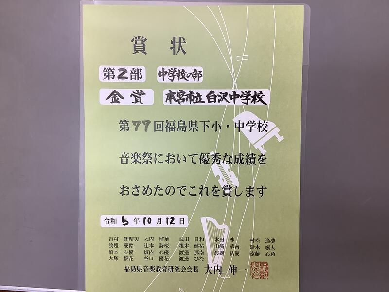 さて、昨日の第77回福島県下小中学校音楽祭(白河コミネス)で、吹奏楽部が見事金賞を受賞しました。本当におめでとうございます。吉村部長も「笑顔でやりきりました」と話していた通り、すばらしい演奏だったと感想を聞くことができました。地区予選の壮行会演奏と直前の演奏の違いがすぐにわかるほど短期間の間に成長があったのだと思います。遠藤教諭の継続した指導、そしてプロ演奏者からのアドバイスを受けて、それを実践してきた努力が一つの結果として表れたのだと思います。本当におめでとうございます。白中祭での演奏も非常に楽しみです。