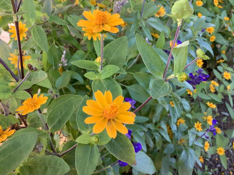 メランポジウム(人権擁護員の方々にいただいたもの)、ブルーサルビアも元気に咲いています。