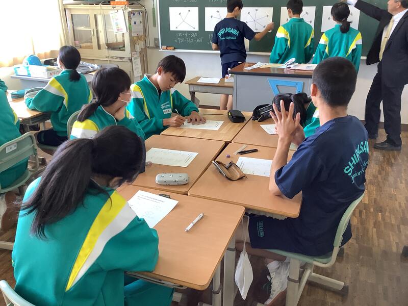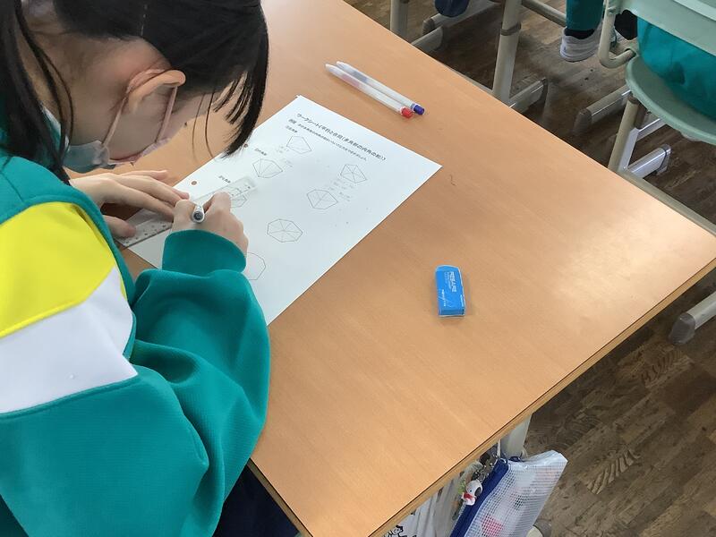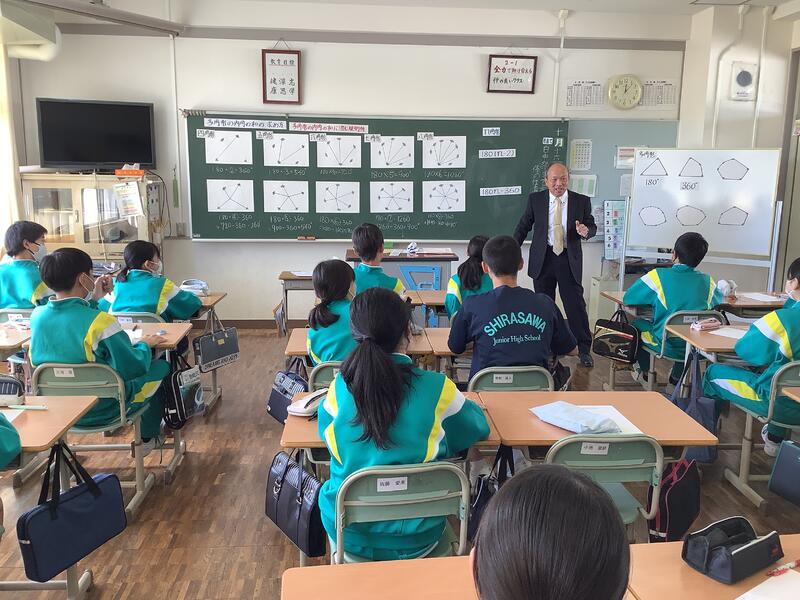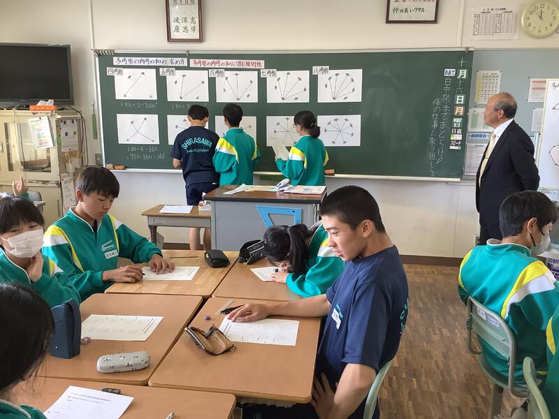 授業の一コマの紹介です。本日、本校に数学の支援として月曜日に勤務している三津間アドバイザーの授業を2年1組で行いました。多角形の内角の和を求める活動を行いました。生徒たちが図形の確度を考えるのは、小学校以来。三角形の内角の和が180°であることを利用して、多角形の内角の和を考えていました。説明できそうでできない、わかっているようでわかっていない、ということが確認できた授業となりました。じっくり考える時間があったため、記憶に残る時間になったと思います。