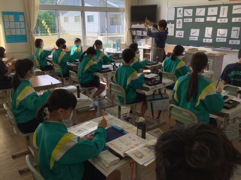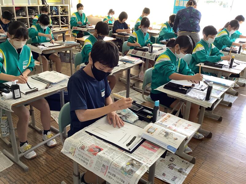 今日は、1年生の書道の授業、2年生の柔道の授業をしていました。書道の授業では、道具の置き方から始まり、足の付き方、左手の付き方など姿勢からの指導でした。その後に筆の持ち方や使い方など確認し、実際に墨をつけて書いていました。全員美しい姿勢で書に向き合っており、佐藤教諭は、心技体という言葉も交えながら語りかけ、生徒達は心地よい緊張感の中で筆を動かしていました。美しい字を書く人は、確かに姿勢も良いのは間違いないようですね。どんな作品ができるのか楽しみです。