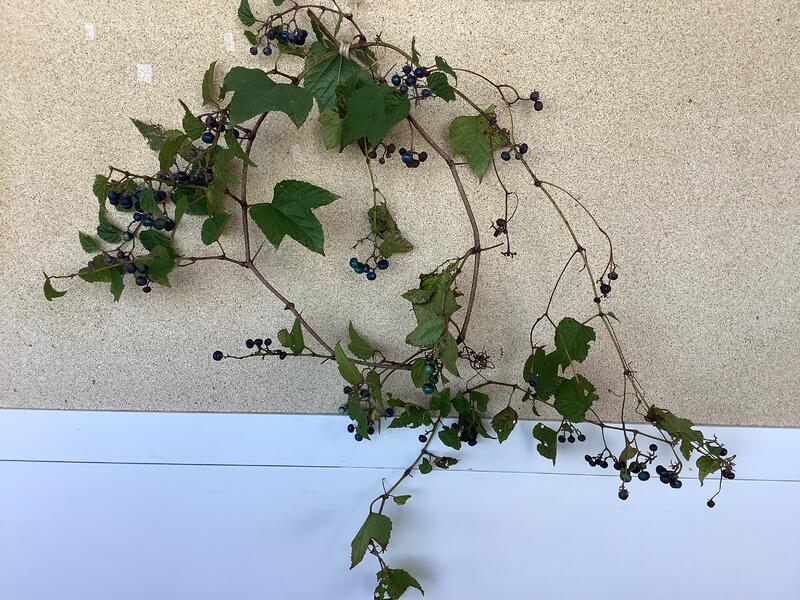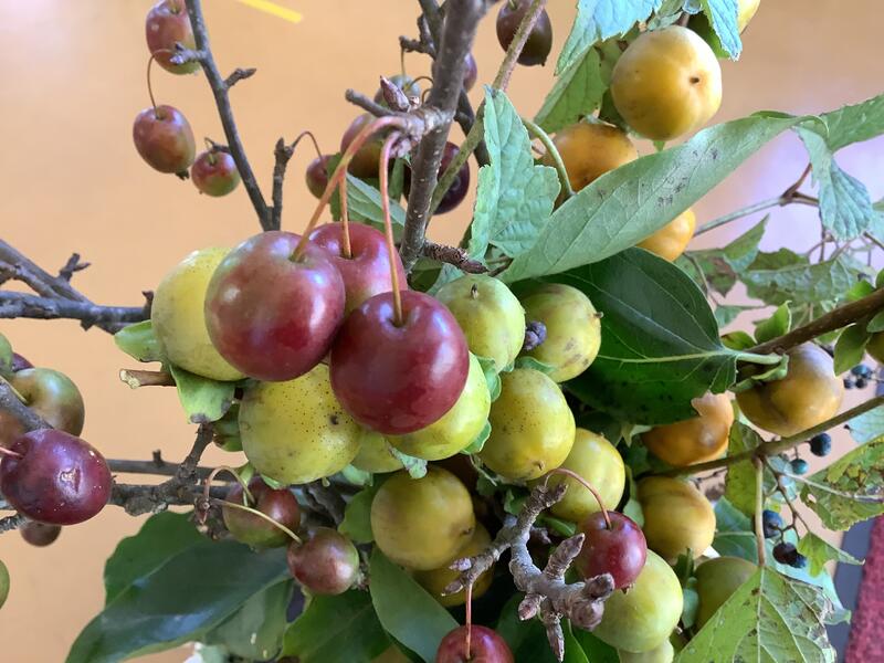 秋満載です。盆栽仕立ての柿、姫りんご、馬ブドウ、そして綿です。