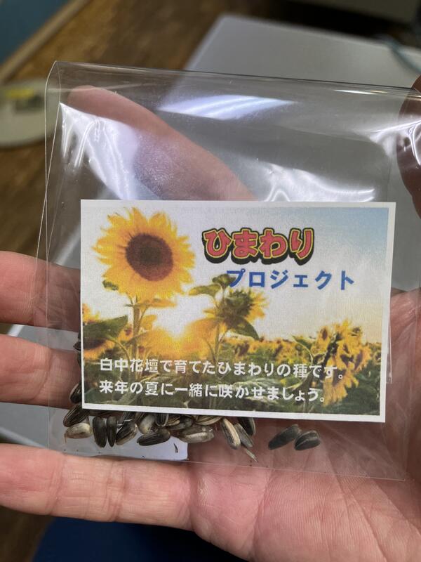 4組では、4組ファームでのびのび咲いていたひまわりのたねを取りました。遠藤教諭が生徒達と、たねをきれいな袋に仕分けしていました。来年もきれいなひまわりで環境を美化させて、心を癒やす空間になればいいなと思います。