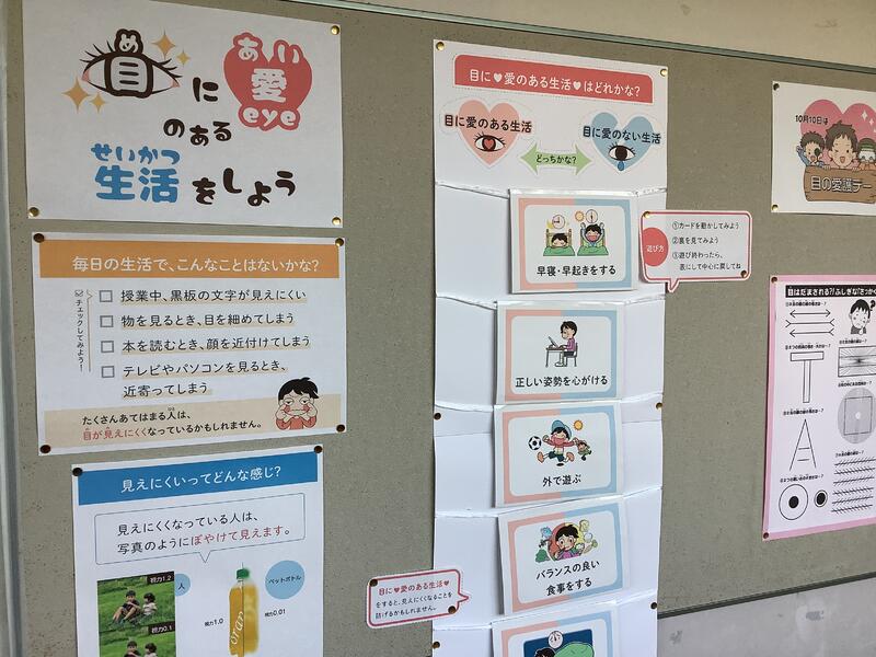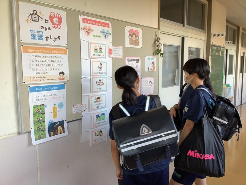 保健室前は、「目に愛(eye)のある生活をしよう」という掲示がしてあります。見えにくいとは?愛のある生活とは?など、生徒が見やすい、興味がもてる掲示がしてあります。保健室前を通る生徒たち、立ち止まって見ています。