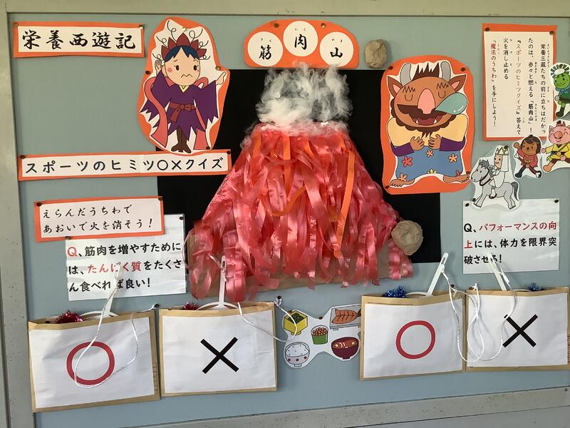 配膳室前には、「食事とパフォーマンスについて」の掲示があります。○、×のうちわには、職員の顔写真が貼ってあり、楽しく学習できるようになっています。給食係の生徒達はよく掲示を見て楽しんでいます。