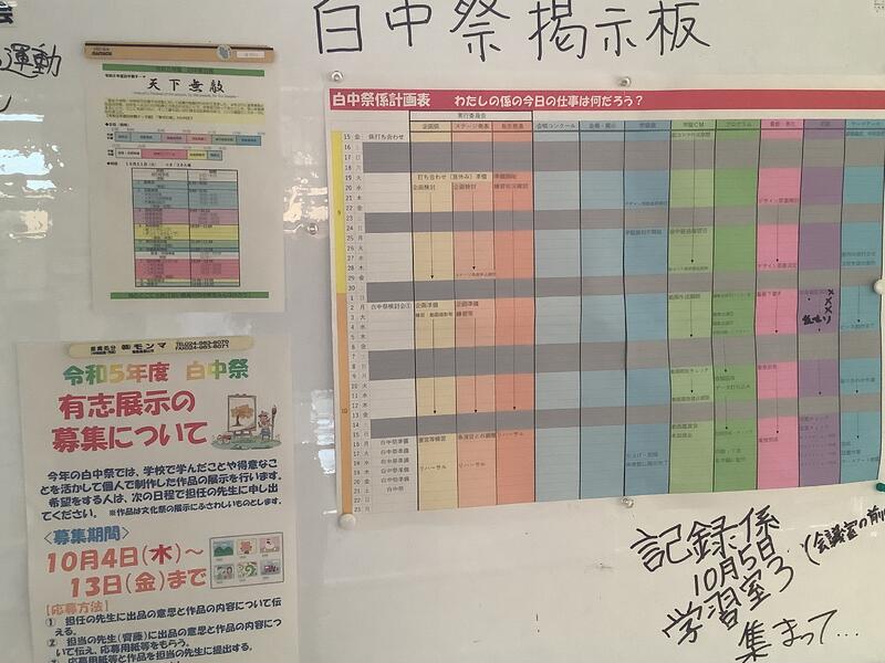 今日も、3年生を中心に白中祭の準備をしていました。前向きに活動をしていて、本当にすばらしいなと感じています。生徒会担当教師からは、当日までの各係の活動日程か提示され、活動の見える化がされていました。時間を有効に使うこと、マネジメントすることの効果を期待しているようです。みんなが達成感を味わうことができる活動を今後もさせていきたいと思います。