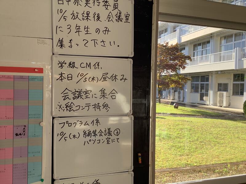 今日も生徒の活発な活動を見る時間が多くありました。白中祭の係活動を計画的に行おうと、係のリーダーがボードを利用し、連絡調整を行っていました。昼休みの短い時間を利用したり、放課後の時間を利用したりとさまざまです。1,2年生の運動部の多くは、週末に県北大会を控え、吹奏楽部は、メイプルコンサートと県下小中学校音楽祭を控えており、活動バランスをコントロールする必要性があると実感しています。生徒達との会話を密にして、無理のないように調整していきたいです。