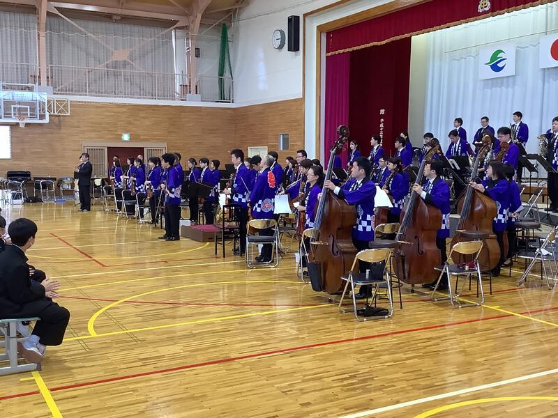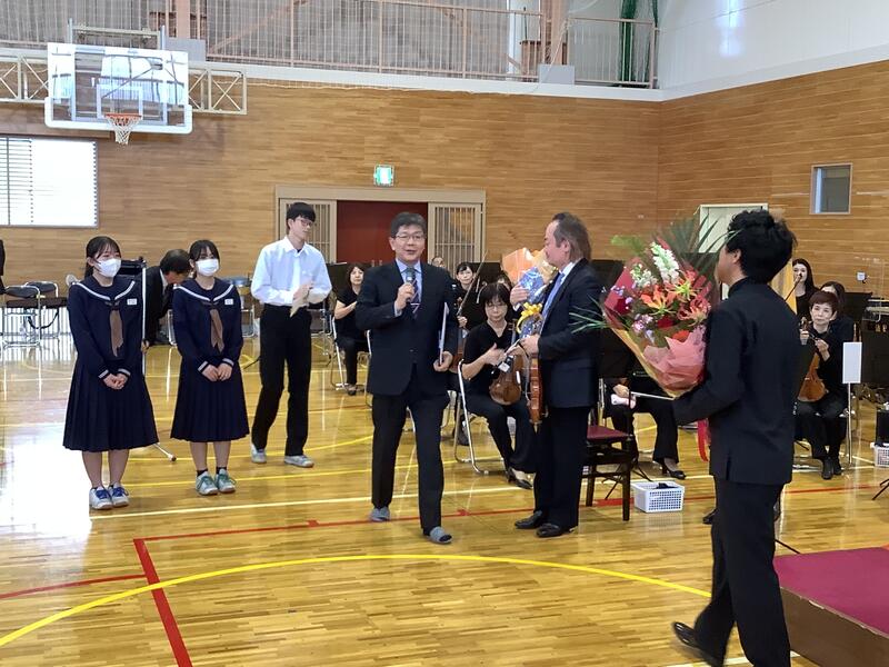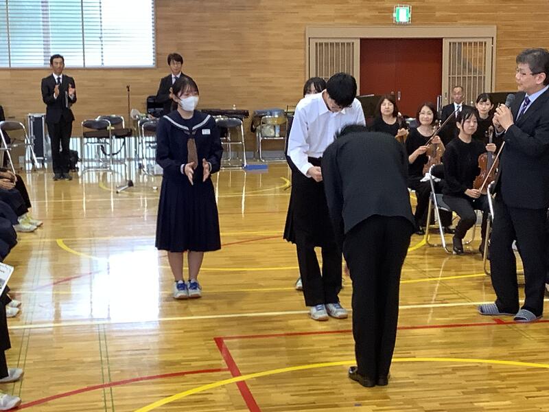 お礼の言葉を柴原侑希さん、花束贈呈を林星穂さん、佐藤言美さんが務めました。そして、オーケストラで録音した校歌と楽譜をいただきました。
