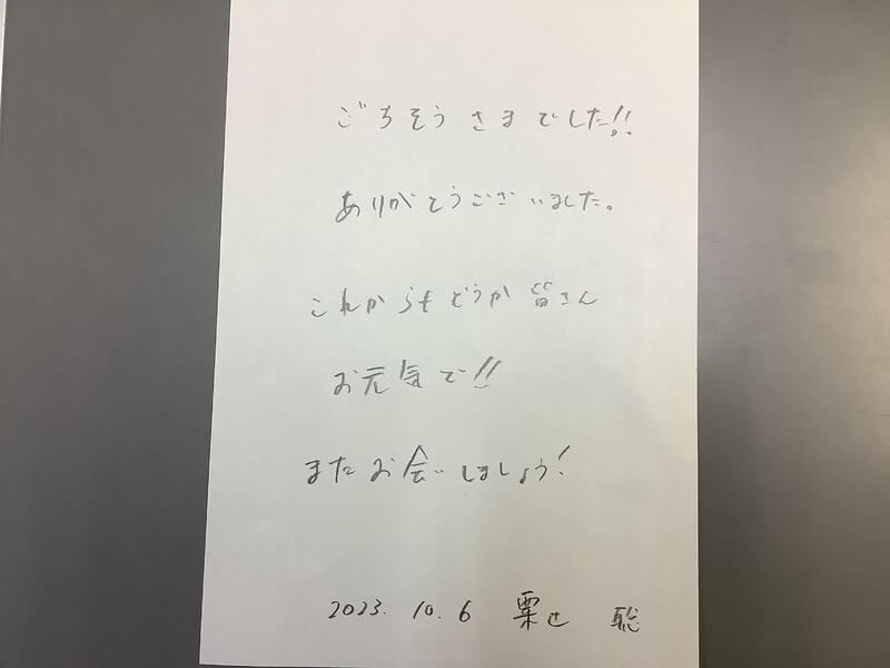 本宮市のお菓子を控え室においておきましたら、指揮者の粟辻さんからのメッセージが机上にありました。ちょっとした心遣いにも感動です。