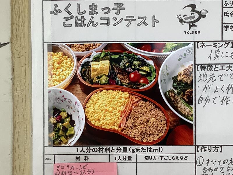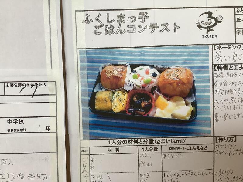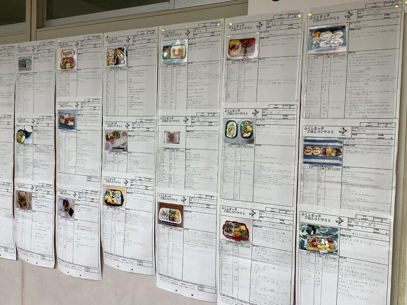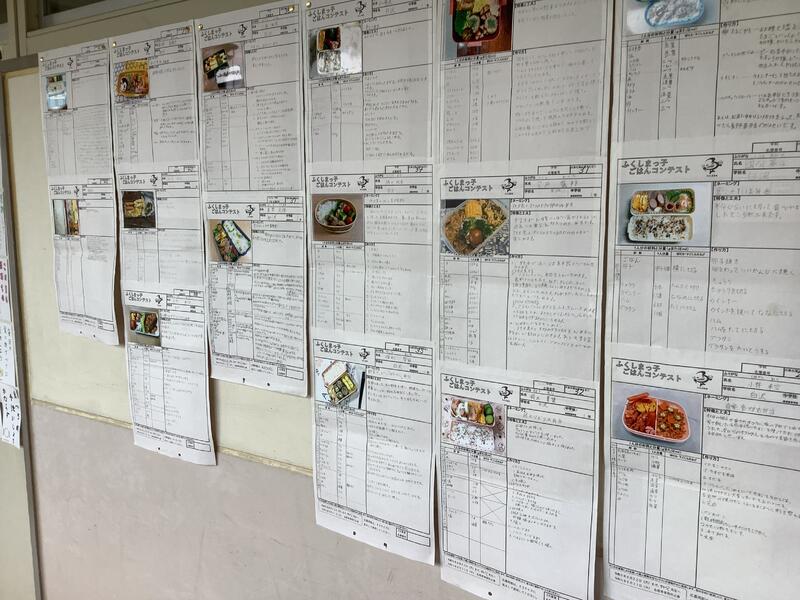 廊下には1,2年生が夏休みの課題として取り組んだレポート「ふくしまっ子、ご飯コンテスト」を家庭科担当の佐久間教諭が掲示しました。一人一人目を通しましたが、どのお弁当も手が込んでいて、拝見していて笑顔になりました。美しいの一言です。作成にあたり、家族から的確なアドバイスもいただき、苦労して作ったのだと思います。生きることは食べることです。ぜひ、これからも食に興味をもってもらいたいと思います。