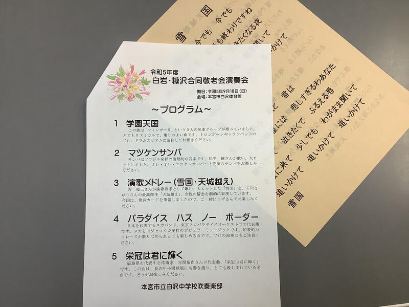 最後に宣伝です。18日(月)、本校吹奏楽部が白沢体育館で「敬老会演奏会」を行います。