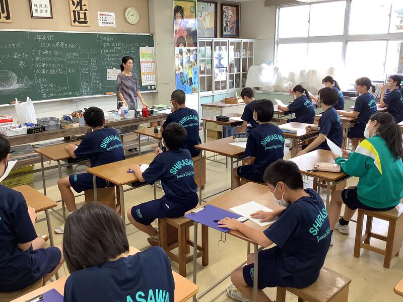 1学年では、学級旗作成の話し合いをしていました。デザインの意味、学級の方向性をしっかりと話し合って、目的をもって話し合いをしていました。上手できれいであれば何でもよい、という訳ではないという方向性が見え、大変すばらしいと感じました。