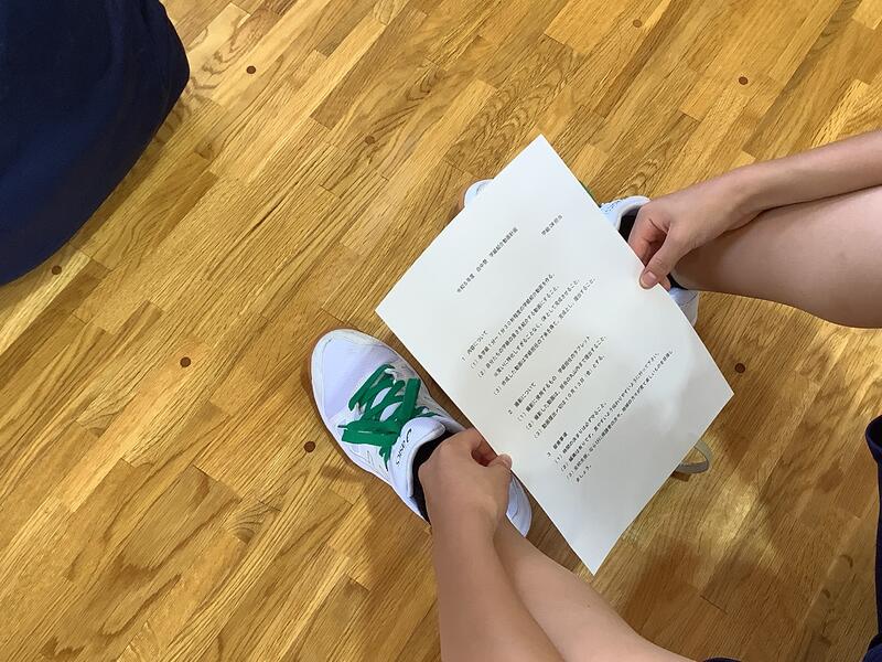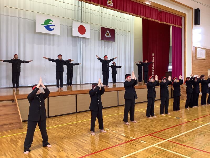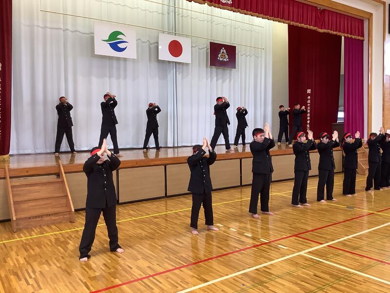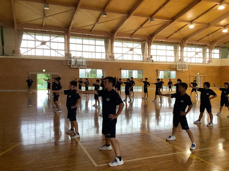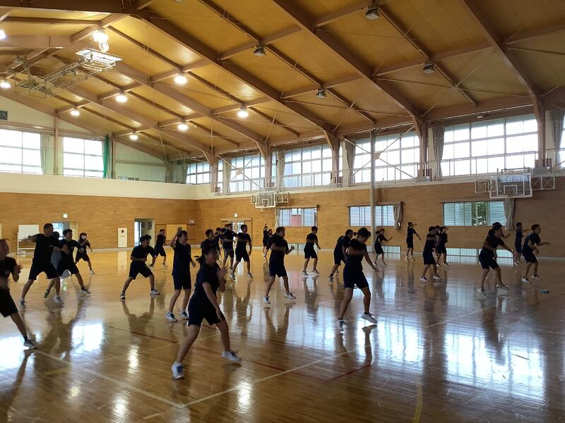 そして、合同練習と同時進行で、体育館では別の生徒が活動していました。今日は水曜日。「よさこい」です。リーダーの渡邊理人さんの気合いのこもったあいさつに始まり、熱のこもった練習をしていました。テスト前の練習よりよくなっていました。丸山内教諭の「あいさつにはじまり、あいさつに終わる」「心を込めて大きく演舞」など一言一言を真剣に生徒達は聞き、実践していました。来週は、更によくなっていることを期待したいです。