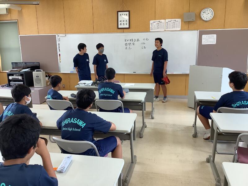さて、テスト明けの午後は、文化祭の全体打合せを行いました。生徒会本部役員、白中祭実行委員会が中心となって、係ごとに分かれて10月21日(土)の本番までのスケジュールを確認しました。ステージ発表、合唱、作品展示など、さまざまです。今回も実行委員長の渡辺悠斗さんから「先生や他の誰かが準備するのではなく、自分たちでアイディアを出し合って、思い出に残る白中祭をつくろう」と全校生にうったえていました。ここから、どんな動きが始まっていくのか楽しみです。