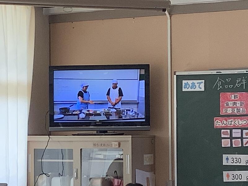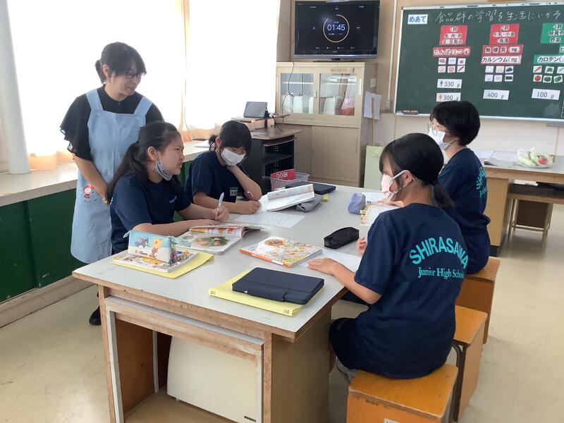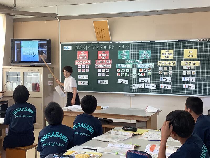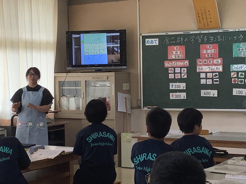 さて、今日は1年生の家庭の授業をKAGOMA様に協力して検査していただいた「ベジチェック」のデータをもとに行いました。佐久間教諭、深谷栄養技師による授業で、生徒の興味・関心を引きつける手立てが豊富に盛り込まれており、自身の食生活について見直しをさせたり、野菜を多く摂るための簡単レシピを実演したりして楽しい授業を行っていました。「バランスの良い食生活を実現するために工夫できることはないか」と、一人一人が主体的に話し合う姿が見られ大変すばらしかったです。丸山内教諭のクッキング動画も視聴し、大盛り上がりの授業でした。