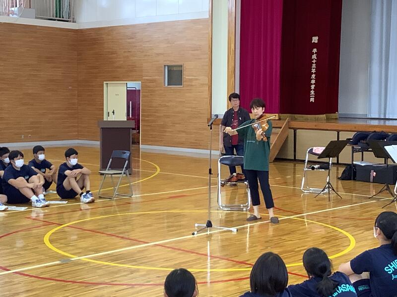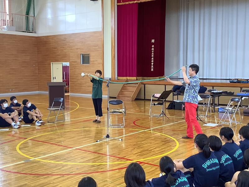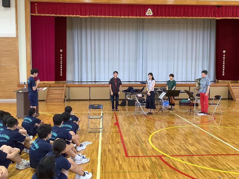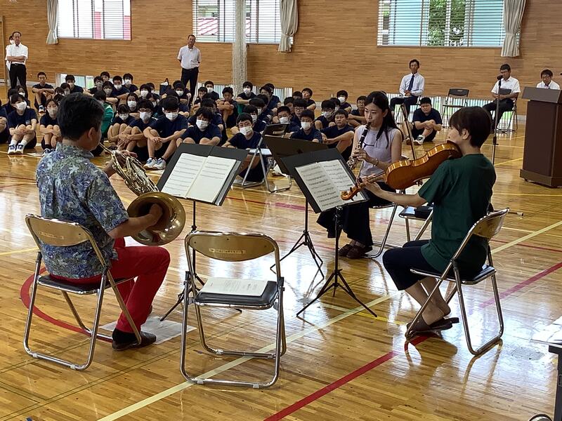 今日は、10月6日(金)に開催される山形交響楽団による演奏に先立ち、事前ワークショップを行いました。ワークショップを実施することのねらいは2つです。1つ目は、本公演に対する期待を膨らませる時間、2つ目は、本公演を楽しむための予備知識を自然に獲得できる場とするということです。このねらいのもと、楽団より4名の講師の方に来校していただき、午後の1時間楽しく学ぶことができました。弦楽器、木管楽器、金管楽器の音の出る仕組み、楽器の種類やオーケストラの並び方など、写真や生の演奏を披露しながらわかりやすく丁寧に説明をしていただきました。その他、楽器の体験や質問の時間も確保していただき、生徒達は、積極的に楽器の演奏や質問を行い、みんなでワークショップを盛り上げることができました。質問には、「プロを目指したのはいつから」「楽器を始めたのはいつから」などがあり、どの質問にも、一人一人丁寧に答えてくださいました。ただただ、一番の驚きだったのは、ヴィオラ、クラリネット、ホルンだけの演奏です。3人だけの演奏とは思えない音質、そしてその響きには、心が動かれました。本番の60名以上のオーケストラはどうなってしまうのか、今から楽しみです。保護者の皆様はぜひ本番の演奏に来校していただければと思います。
