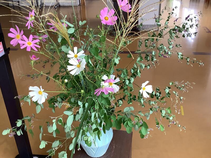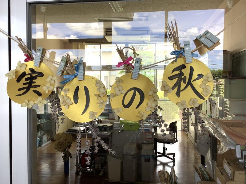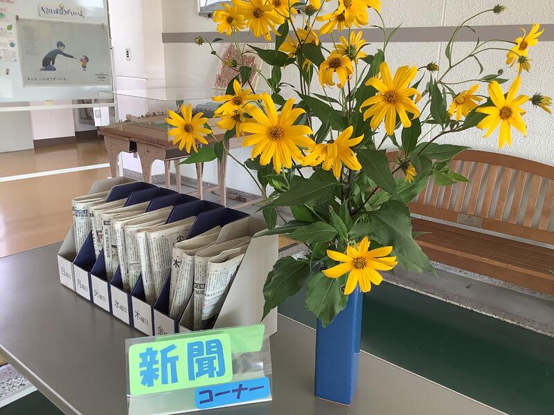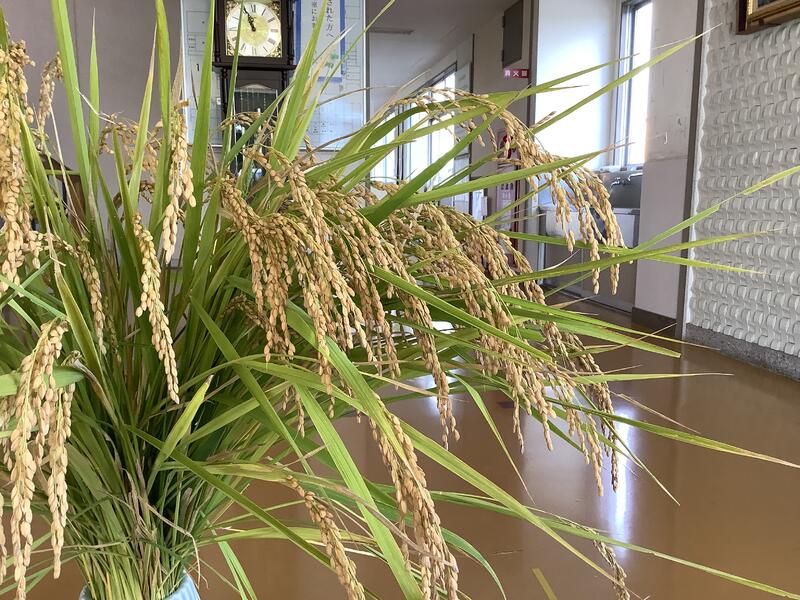 今日、職員玄関には、秋を感じる稲穂とキクイモ(菊芋)の花を飾りました。深谷さんに自宅から持参していただき、守谷さんが生けてくれました。実は、何気なく咲いていたこの花が、キクイモという名前だったことを知りませんでした。注意深く見渡すと、道端にきれいに咲いていますね。美しいものを見て、季節を感じることができることは幸せなことです。