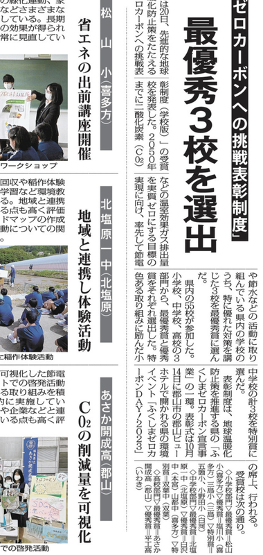 最後に、本日21日(木)の福島民報に「ゼロカーボンの挑戦」の表彰結果が載っていました。本校が「優秀賞」に選出されていました。大変光栄なことです。生徒会担当の清水田教諭がまとめ上げたレポートに、高い評価をいただきました。内容は、本校で行っている、緑のカーテン、節水、節電、農園などの取り組みをわかりやすく説明したものです。10月に生徒と発表する機会があるようですので、またHPで紹介したいと考えています。