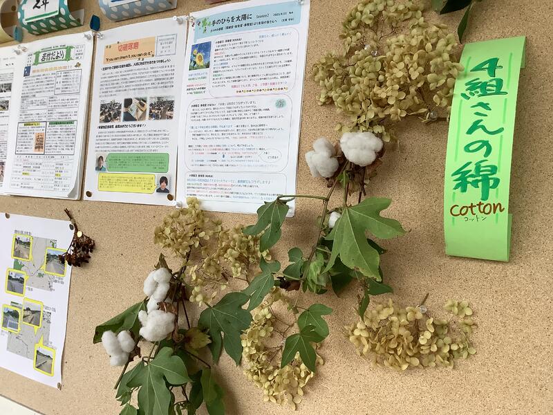 本日は、過ごしやすい一日。ようやく秋を感じることができました。4組ファームで心を込めて育てた綿をきれいに廊下に掲示しました。「綿ってこんなふうにできるんだ」と感心する生徒もいました。けっこう実物を見るのは、初めてという人もいるようです。