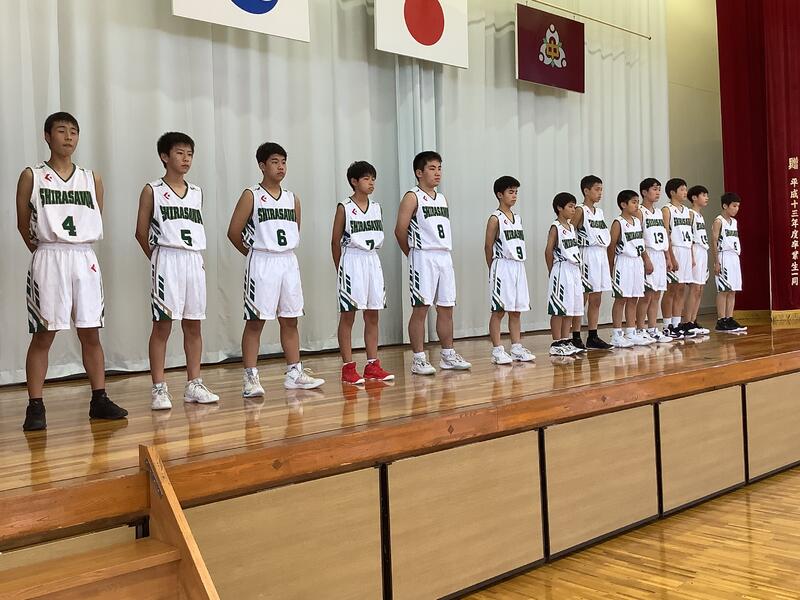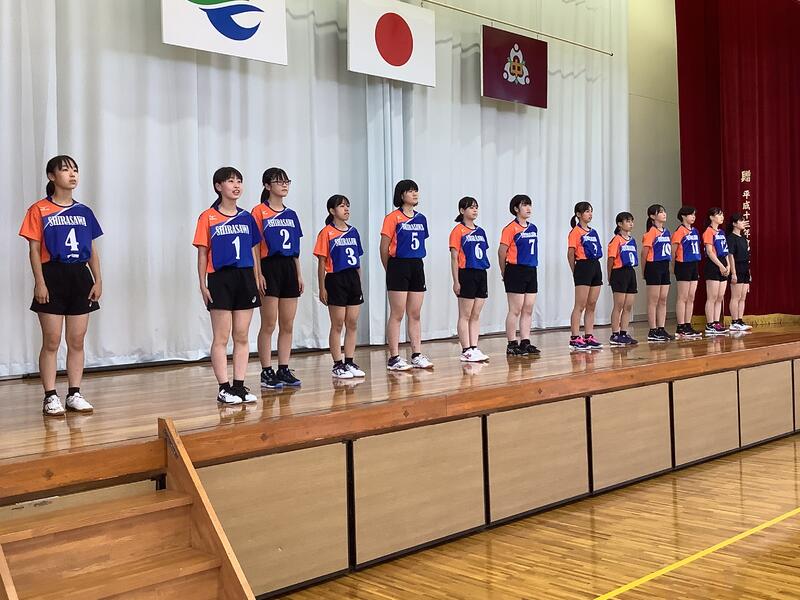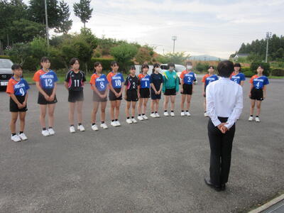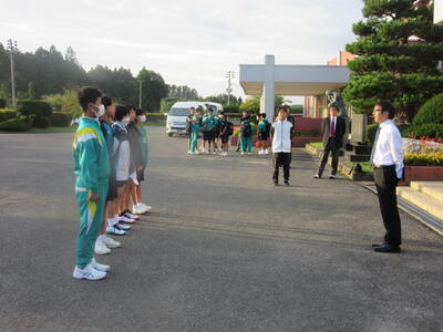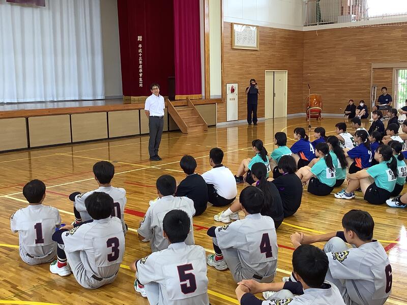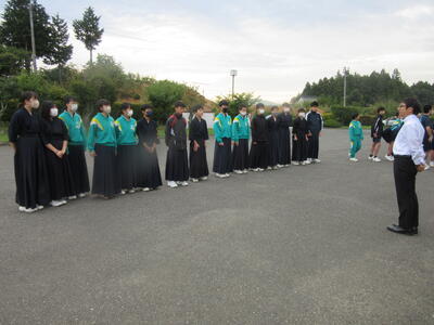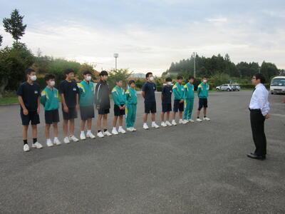 「入場する様子を見て、数ヶ月前よりも大変たくましくなった1,2年生を見て、大変嬉しく思います。これまで、3年生が抜けて、不安を感じて練習をすることもあったと思います。練習する中で3年生の偉大さを感じることもあったでしょう。しかし、みんなは、夏の暑さの中でも心と体を鍛えて一生懸命に練習を頑張ってきました。上手くいったこと、上手くいかなかったことをたくさん経験してきたと思います。私は、練習の様子を見学して実感しています。新人大会では、必ず勝ち負けがあります。大会では、練習試合とは違って、すばらしい経験をすることができると思います。そして、大会中は、自分を信じ、仲間を信じやりきってほしいです。また、大会はいろいろな人のサポートがあります。あいさつや感謝の気持ちは、すべての土台となります。その気持ちも心に留めて、戦ってきてください。3年生へ。3年生からの熱いエールで1、2年生のすばらしい力を引き出してほしいです。今日の壮行会での後押しをどうぞよろしくお願いします。」このような話で気持ちを高めてくれました。