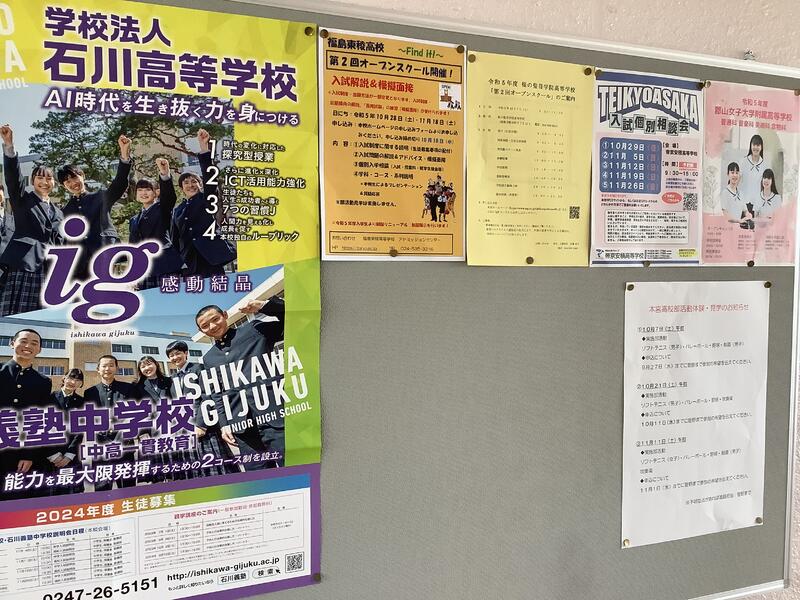 最後に、3年のフロアには、高校体験入学のポスターがたくさん。時間があるのならば申し込んで、一度高校に足を運ぶことを生徒達には話しています。情報は、いろいろとインターネットにありますので各高校のHPを検索してみてください。