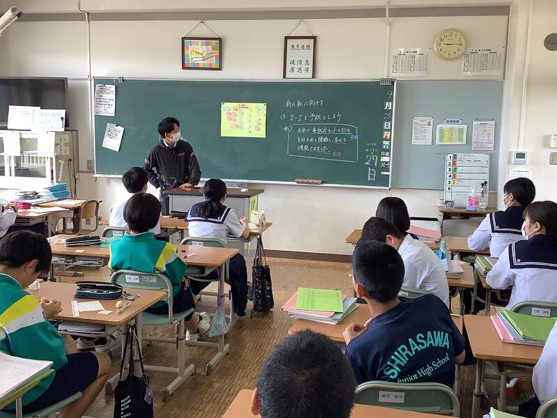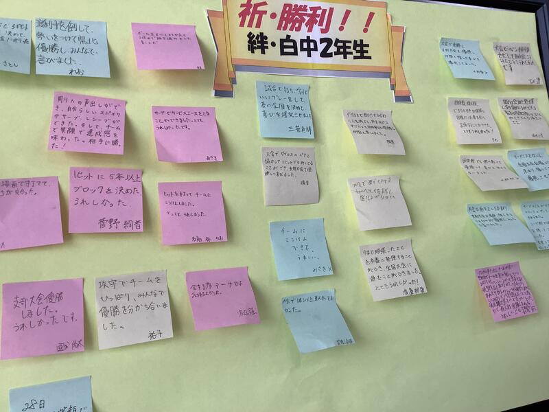 さて、今日の2年生は、新人大会に向けて頑張るという雰囲気がありました。学級活動では、お互いに頑張ろうというメッセージを書いて、気持ちを盛り上げるのと同時に、所属感を高めるような活動をしていました。清水田教諭は、大会で勝ったことをイメージして、その感想を発表させる活動をしていて、大変盛り上がっていました。前向きな気持ちを言葉に出すと、自分も他の人もその前向きな気持ちを聴くので、上昇志向になるのだと思います。大変興味深い活動でした。
