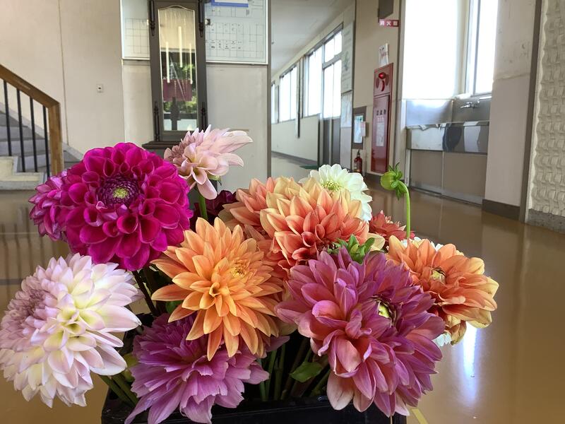 また、出勤すると職員玄関には、ダリアが飾ってありました。週末に校長が塙町から摘んできてくれたようです。美しい花は、忙しい日中に癒やしを与えてくれます。心が整いますね。