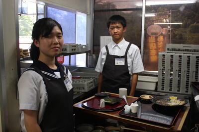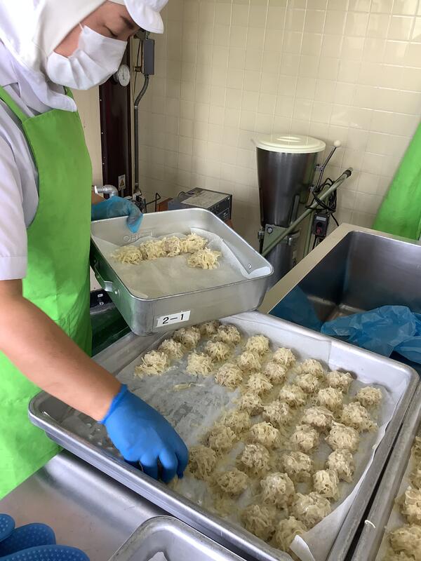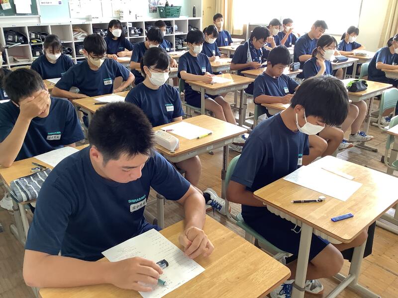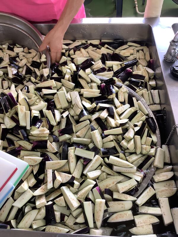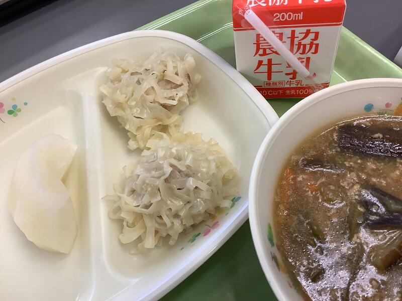 そして、給食です。連日の猛暑の中でも調理場は火を使っていますので、ものすごい室温になっています。今日のメニューは、手作りシューマイ、麻婆ナスでした。調理員さんたちが愛情を込めてつくってくれました。非常に美味しくいただきました。生徒達も大絶賛でした。聞いたところ、シューマイの味付けは何と塩麹と鶏ガラだそうです。醤油は使っていないとのこと。塩麹は、お肉を柔らかくしてくれるそうです。暑さに負けないようにと、発酵食品で腸内環境を整える意味もあるのかなと思います。健康な日本人は、昔から味噌や納豆など発酵食品を毎日当たり前のように食べていますよね。腸内環境も非常に整いました。