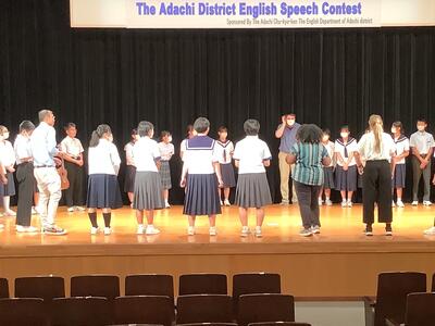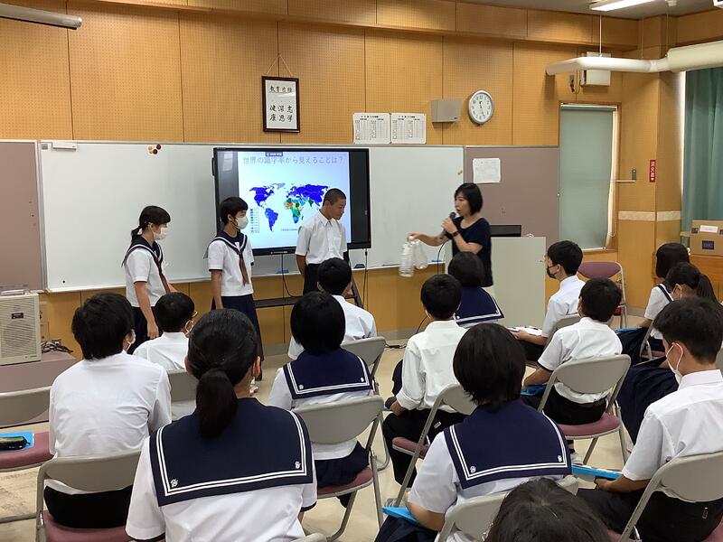 1年生は、国際理解学習を行いました。県国際交流課を通して講師として、武田さんをお招きし、「世界がもし100人の村だったら」という題で、世界の多様性について、わかりやすく教えていただきました。地域別の人口密度の違いを体験したり、ことばの違いを実感したりすることができました。自分たちの常識と世界の常識の違いを知ることで、お互いに認め合う気持ちが芽生えるのかと思います。いろいろな考えを体験したり聞いたりすることの大切さを実感することができました。