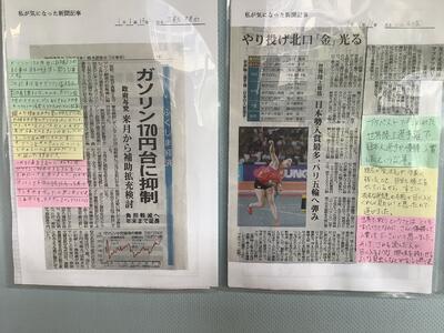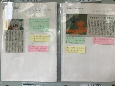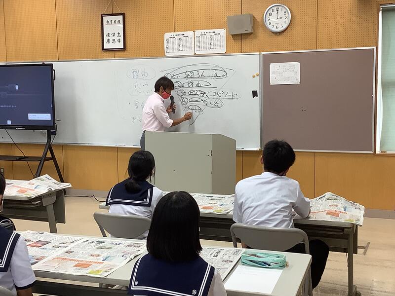 1年生は、実際に新聞を開き、新聞の記事を読んで、どのようにして新聞記事を書いているのかを紹介していました。新聞は、始めに結論を書いて、その後に背景など詳しいことを書くのが基本だそうです。話を聞いて、実際に記事を読んでみるとそのような構成になっており、再確認することができました。忙しい日々でも大まかに見出しを読むだけで、書いてある内容がわかるということです。その構成は、小論文や読書感想文など、文書を書くうえでもとても重要だとおっしゃっていました。大変勉強になる時間でした。