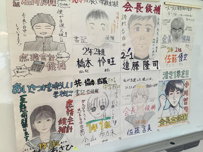 昨日から、生徒会役員の選挙活動を行っています。本日は、2年生が職場体験活動のため、1年生の立候補者が行っていました。応援責任者のアドバスをもらい、どのようにして3年生に顔を覚えてもらうか一生懸命でした。1年生は、選挙とはどういうものなのか、投票とはどういうことなのか、すべてが初めての経験だと思います。社会がどのような仕組みでつくられていて、民主主義とはどういうことなのかを同時に学習できる機会となります。学校としても、至らないところはたくさんありますが、できるだけ世の中の仕組みに近づけて学習をさせていきたいと思います。