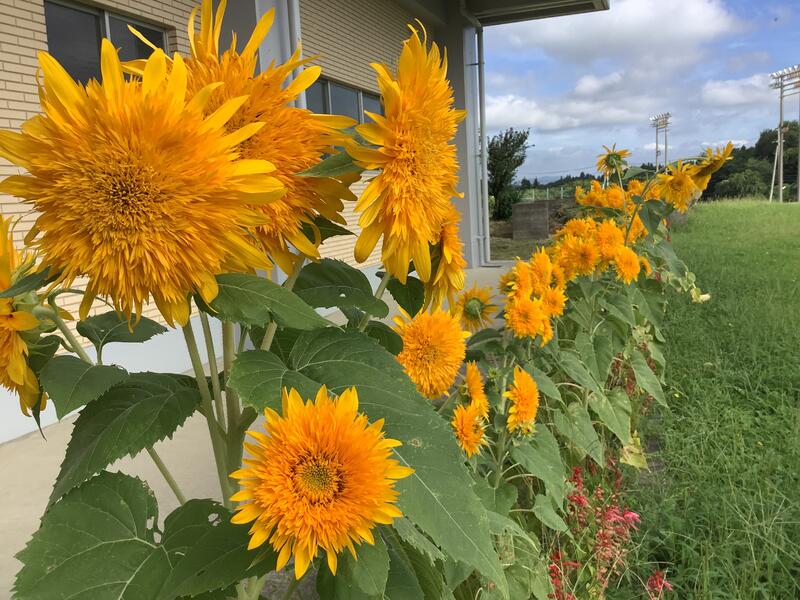 人権委員の方々に植えていただいたひまわりが、いきいきと体育館前で咲いています。植えたころは、植えられているのを知らない生徒に踏まれていました。それでも芽を出しました。そして、40℃近くになっても、夏休み中は水が十分に与えられていなくても、立派な花を咲かせて存在感を示しています。植物のたくましさに感動です。