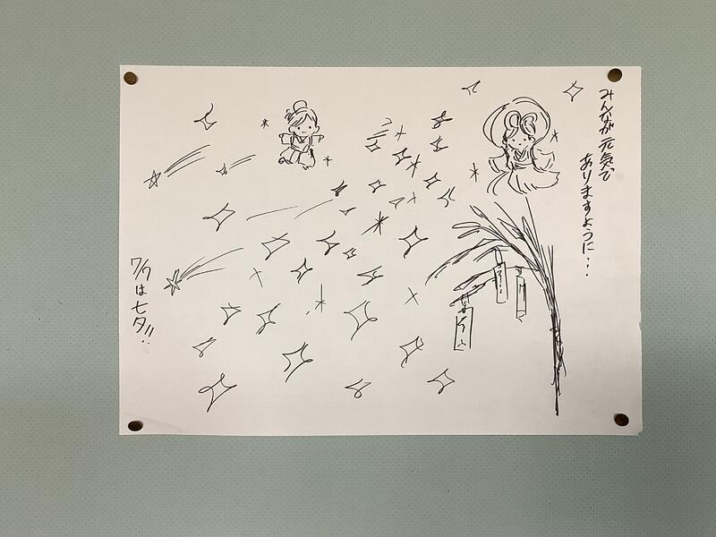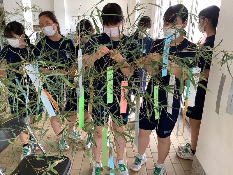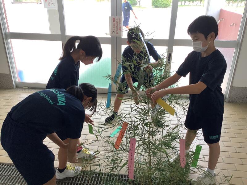 本日全校で、昨日届いた笹に、願い事を書いた短冊を結びつけました。何事もですが、節目で自分自身を見つめ、書いたり発表したりする表現はとても大切なことです。見える化すると自分も意識しますし、それを見た他の人も意識します。そうすると見えない何かが動き出して願い事が叶う方向に進むのかもしれませんね。このイベントは本当にすばらしいですね。職員も書きましたので、授業参観で来校した際には、ぜひご覧ください。