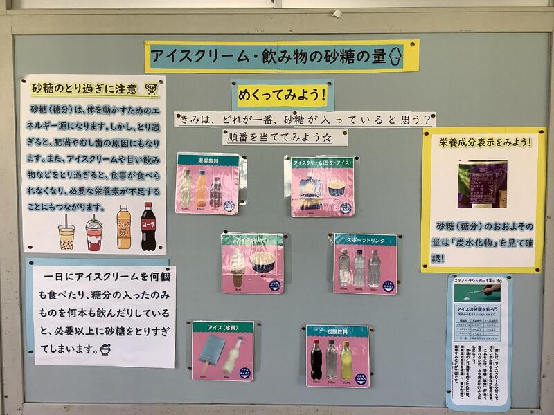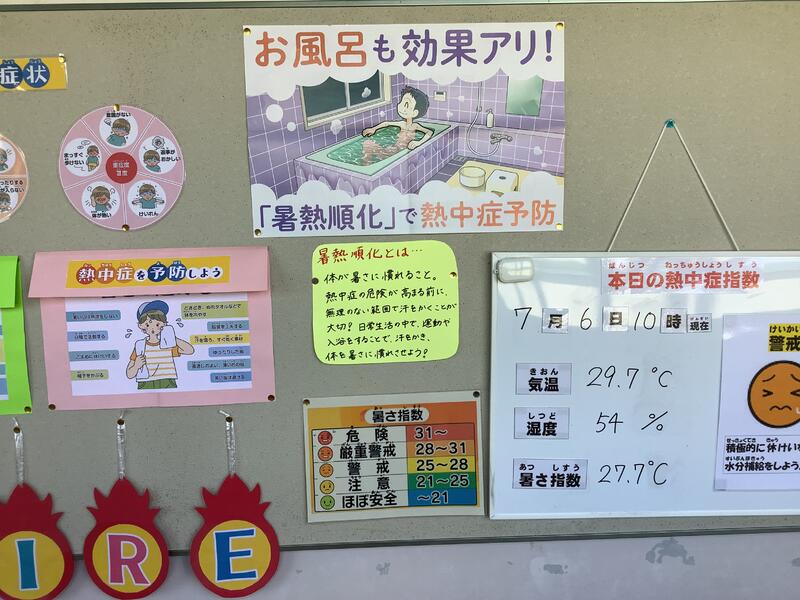 保健室前の熱中症対策。お風呂に入ることも対策になるようです。