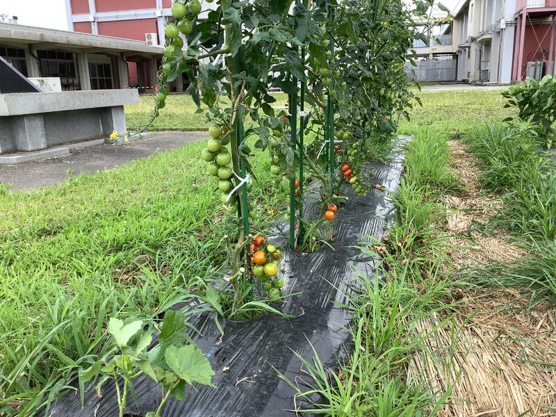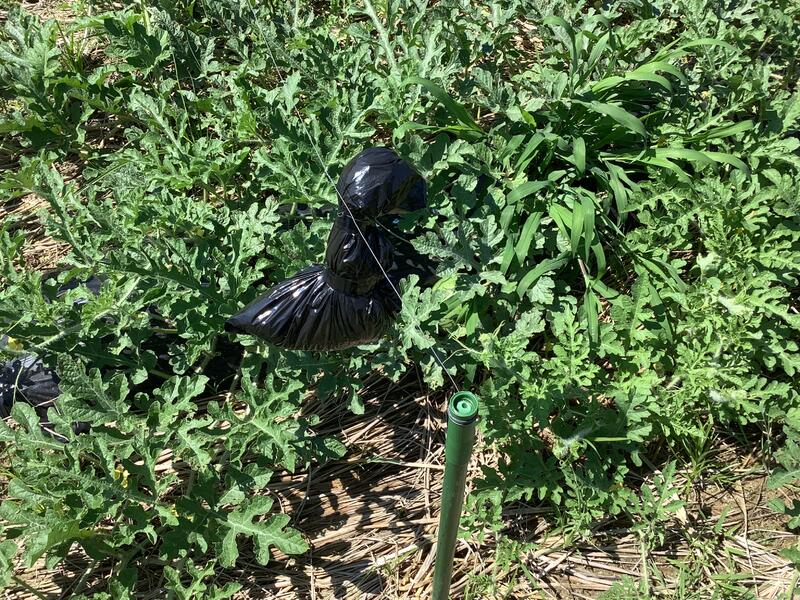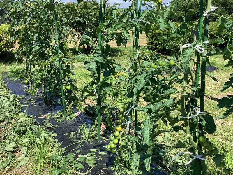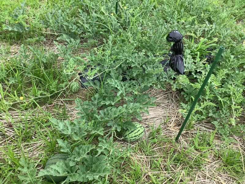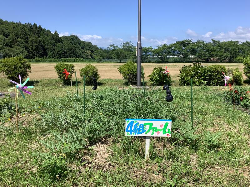 最後に4組ファームより。太陽の光と雨をたくさん浴びて、すくすく育っています。トマトもたくさんな実っています。愛情が伝わっているのでしょう。そして、カラス対策のゴジラ?がしっかりとたくさんのスイカを見守っています。