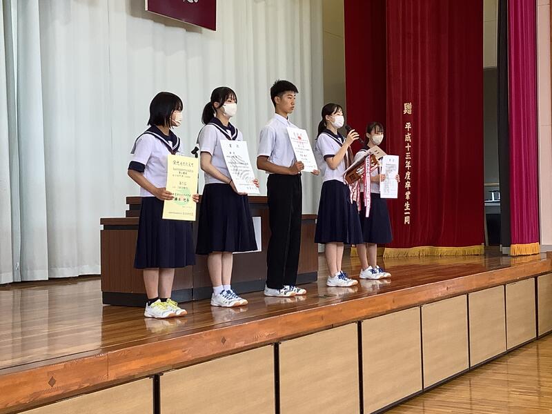 本校では、表彰披露をステージ上で行い、必ず一言、大会に出場しての反省や今後の取り組み方について発表する機会を設けています。全校生の前で考えを述べるというのは、経験してみないとわかりません。誰かに考えを伝えるといった表現力の育成にもつなげている活動です。毎回、一人ひとりしっかりと言葉を選んで発表できています。