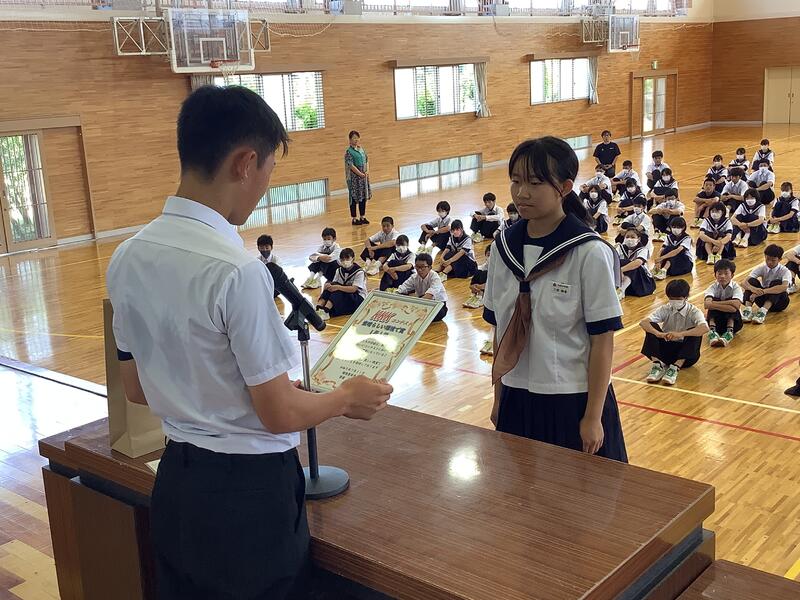 子供は、環境に適応するのが早いといわれています。整理されたきれいな環境にも、雑然とした環境にもすぐに慣れます。環境が人を変えることが多々ありますので、みんなで過ごしやすい環境を整えていってほしいです。最後に講評として、環境委員長の渡邊理人さんが全学級の良かった点、改善点を発表しました。なかなか鋭い視点で審査してくれました。すばらしい委員会の取り組みだと思います。