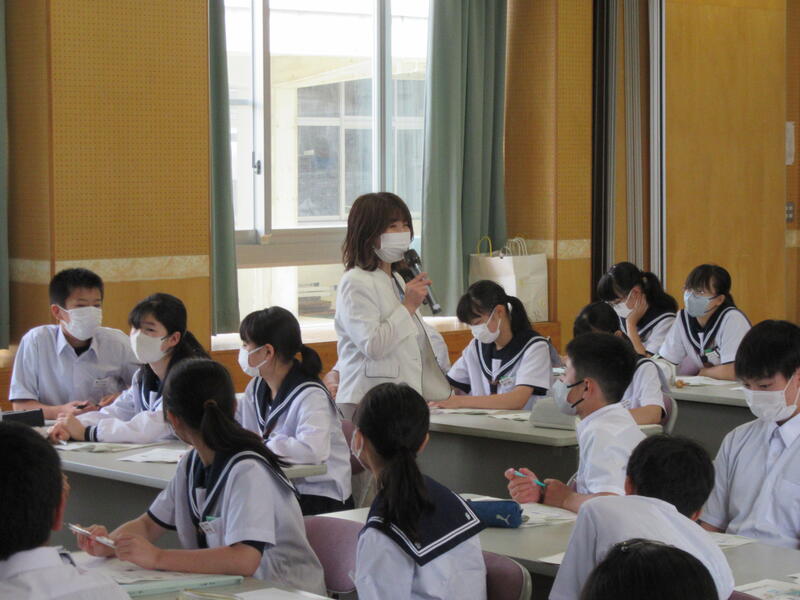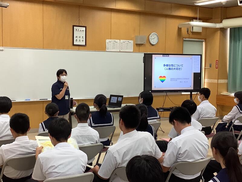 3学年では、性教育講話を行いました。県生活環境部生活環境総務室男女共生課の夏目利江子様を講師にお招きし、「多様な性について」という演題で話していただきました。講話いただいた内容すべてにおいて、自分自身の考え方や振る舞い方、行動について考えさせられる内容でした。LGBTへの考え方についても、社会全体が、まだまだ知識や理解が足りないのが現状です。講話の中で、「世の中には、いろいろな人がいる、それが世界である。知識をつけて知恵を共感してほしい。」「信頼が人間社会の宝物である。」「安心、安全、自由がないと学校生活は楽しくない、あなたは自分の気持ちを大切にしていい。」など大切な言葉をたくさん教えていただきました。紹介しきれないぐらい内容が濃く、「性教育」=「生きるための心の教育」なのだと奥深さを感じることができました。