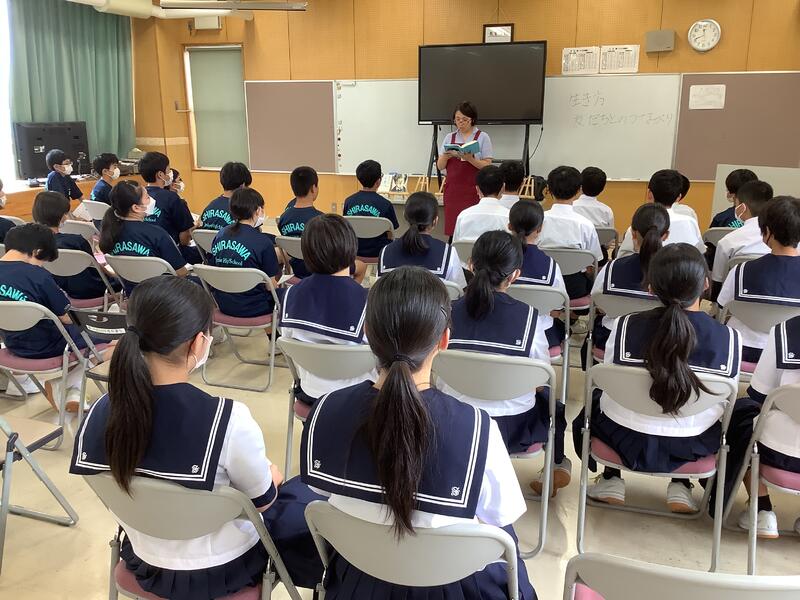 本日は、1年生でいつも中学校の図書室の管理をしていただいている、しらさわ夢図書館の安達さんに来校していただきまして、ブックトークを行いました。今回のテーマは、「~生き方~友達とのつながり」ということで、6冊の本を紹介していただきました。ブックトークを聞いていると、「読みたい!」と思えてくるので不思議です。ネタバレしないように、そしてわかりやすく内容をつたえることができる安達さんのすばらしさも感じました。いつも思うのですが、魅力的な本はたくさんあるのに、見逃していることが本当に多いです。さっそく、本を借りようとしている生徒もいて、すばらしい機会だったと思います。本は新たな発見をもたらせてくれますね。