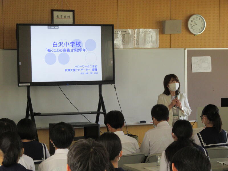 本日は、2学年でハローワーク二本松就職支援ナビゲーターの齊藤様を講師としてお招きし、「キャリア講演会」を行いました。「どうして働くのか」「会社が求める人材とは」「仕事をするときに大切な力とは」など、盛りだくさんの内容を中学生にわかりやすく説明していただきました。あいさつをする、約束を守る、返事をするなど、当たり前のことを無意識にできることが強いということも再確認できたと思います。おそらく、親や教師にも言われていることではありますが、違った立場の方から言われると、スムーズに言葉が入ることがあります。こういった点では非常に、夏休み明けに職場体験学習を予定している2年生にとって、ためになる講話でした。今日の講話を心にとめて、体験学習に臨ませていきたいと考えています。