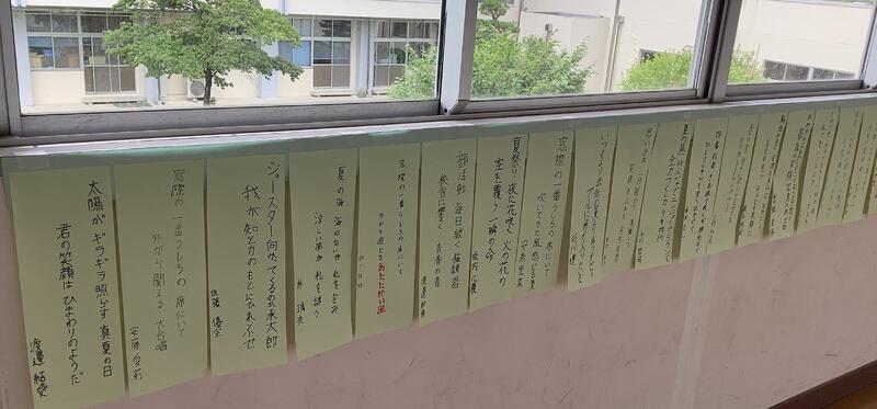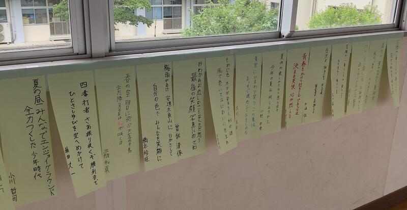 また、2学年では、国語の時間に短歌の鑑賞の授業をしているようです。廊下を歩いて掲示してある短歌を読むと、美しい感性をしている生徒が多いな、と感じます。感じたこと、考えたことを文字で表現することは難しいですが、考えて悩んで作品を仕上げると達成感もあると思います。