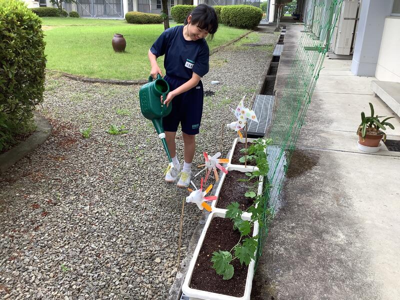 朝出勤すると、中庭にネットが張ってありました。中庭でゴーヤを育てるために遠藤先生が備品を準備して設置してくれたようです。朝のうちに昨日購入した苗を植え、水をたっぷりやりました。順調に成長すると、真夏の日差しをさえぎるカーテンの役目も果たしてくれるようです。これから水やりを欠かさず行って、成長を見守りたいと思います。節電効果も期待でき、まさにエコエコ活動ですね。