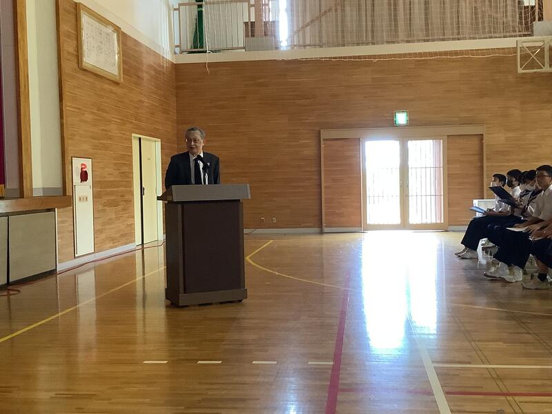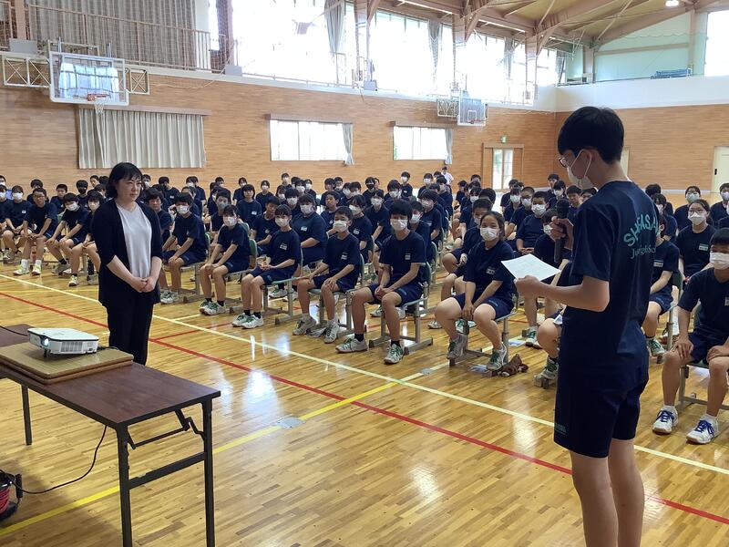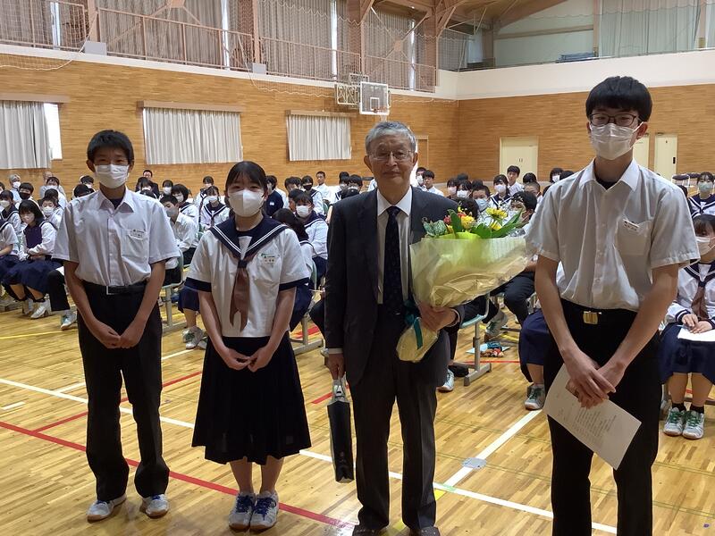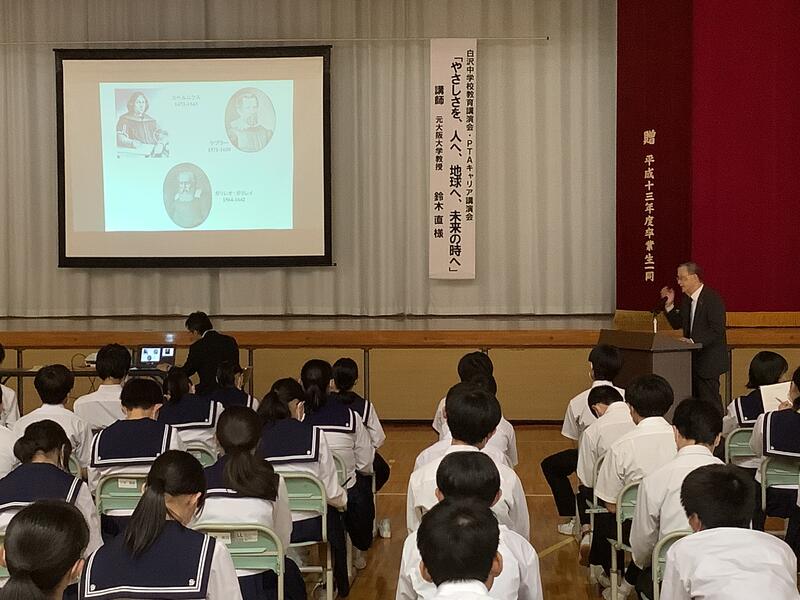 昨年12月に福島県県外在住功労者知事表彰を受賞された元大阪大学教授の鈴木直先生にご講演いただきました。鈴木先生は白沢村立和木沢中学校卒業されており、その後、県立安積高等学校、東京大学と進学されました。現在は公益財団法人地球環境センターで理事長をされております。本日の講演では、科学と技術の発展の歴史を振り返りながら、科学・技術と社会の関わりについてお話をいただきました。「科学」は精神的な豊かさを、「技術」は物理的な豊かさを与えてくれるものであり、「科学」は全ての人々が共有できる文化であると生徒たちに伝えていただきました。講演後、たくさんの生徒が質問に手を挙げている様子を見た鈴木先生は、生徒たちの科学に対する関心の高さに大変感動しておられました。今回の講演会はPTA親交づくり委員会の教育講演会として実施し、役員の方々にもご協力をいただきました。生徒を代表して、お礼の言葉を柴原侑希さんが、花束と記念品贈呈を林星穂さんと小川煌斗さんが行ってくれました。