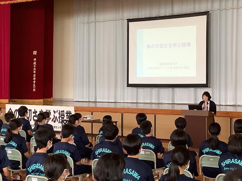 本日は、福島県警本部の菊地様、県民サービス課犯罪被害者支援室心理カウンセラーの神尾様が来校し、「命の大切さ」を学ぶ講演会を実施しました。被害者(被害者とは、被害者と被害者の家族)の立場になることとは、どういうことなのかを、DVDを交えて講演をしていただきました。講演を通して、友達として、親として、教師として、被害者にどのように向き合うのかを考えさせられました。被害者として、身近な人にしてほしいのは「共感」であり、「同情」ではない、そのことばは、腑に落ちる感覚がありました。もしかしたら、普段の交友関係でも、「共感」のスタイルが円滑な関係に役立つのでなないかと、普段の自分自身の振り返りにもなりました。