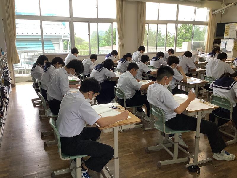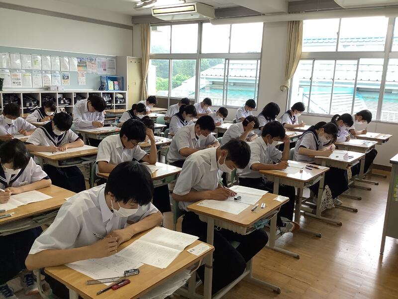 本日は、3年生で第一回実力テストを行いました。ほどよい緊張感をもって一人ひとり取り組んでいる様子がうかがえました。1,2年生の内容がすべて出題されるので、覚えていたはずなのに思い出せないなどたくさんあったかなと思います。テスト終了後、「そうだったー」など、悔しがる生徒もいました。今日のテストをして、復習が必要だと実感した生徒は多いはずです。時間はかかるとは思いますが、一つずつ解決していくと、必ず点と点の知識が結びついて、飛躍的に学力が上がる瞬間に出会います。その瞬間に出会えるように、今後も丁寧に、そして川の流れのように学習していってほしいと思います。